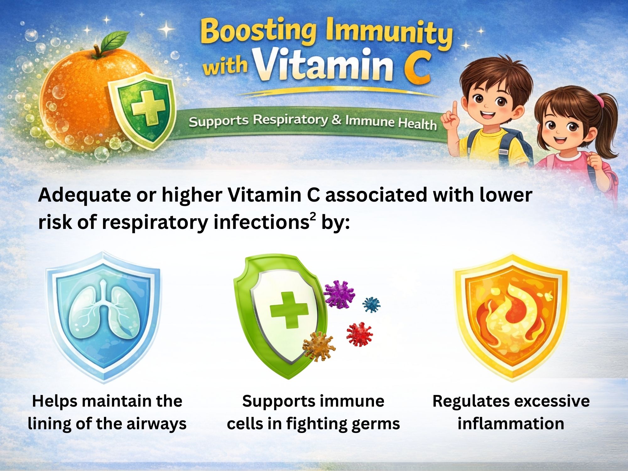 Beyond its reputation as a “cold fighter,” research shows that adequate or higher Vitamin C status is associated with a lower risk of respiratory infections in children and adolescents, and in some cases, milder symptoms or shorter duration of illness2. Because vitamin C is water-soluble and not stored long-term in the body, consistent daily intake is important to maintain levels that support immune function. Vitamin C contributes to immunity by helping maintain the lining of the airways, supporting immune cells in fighting germs and regulating excessive inflammation3.